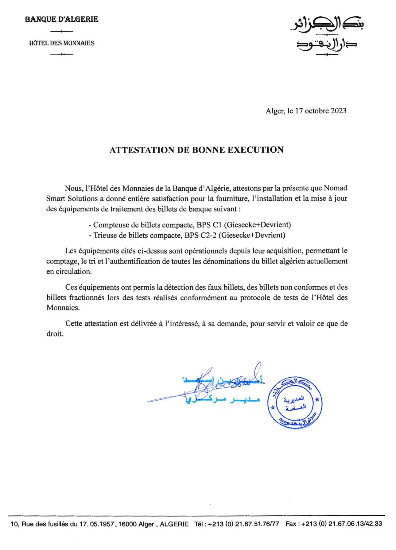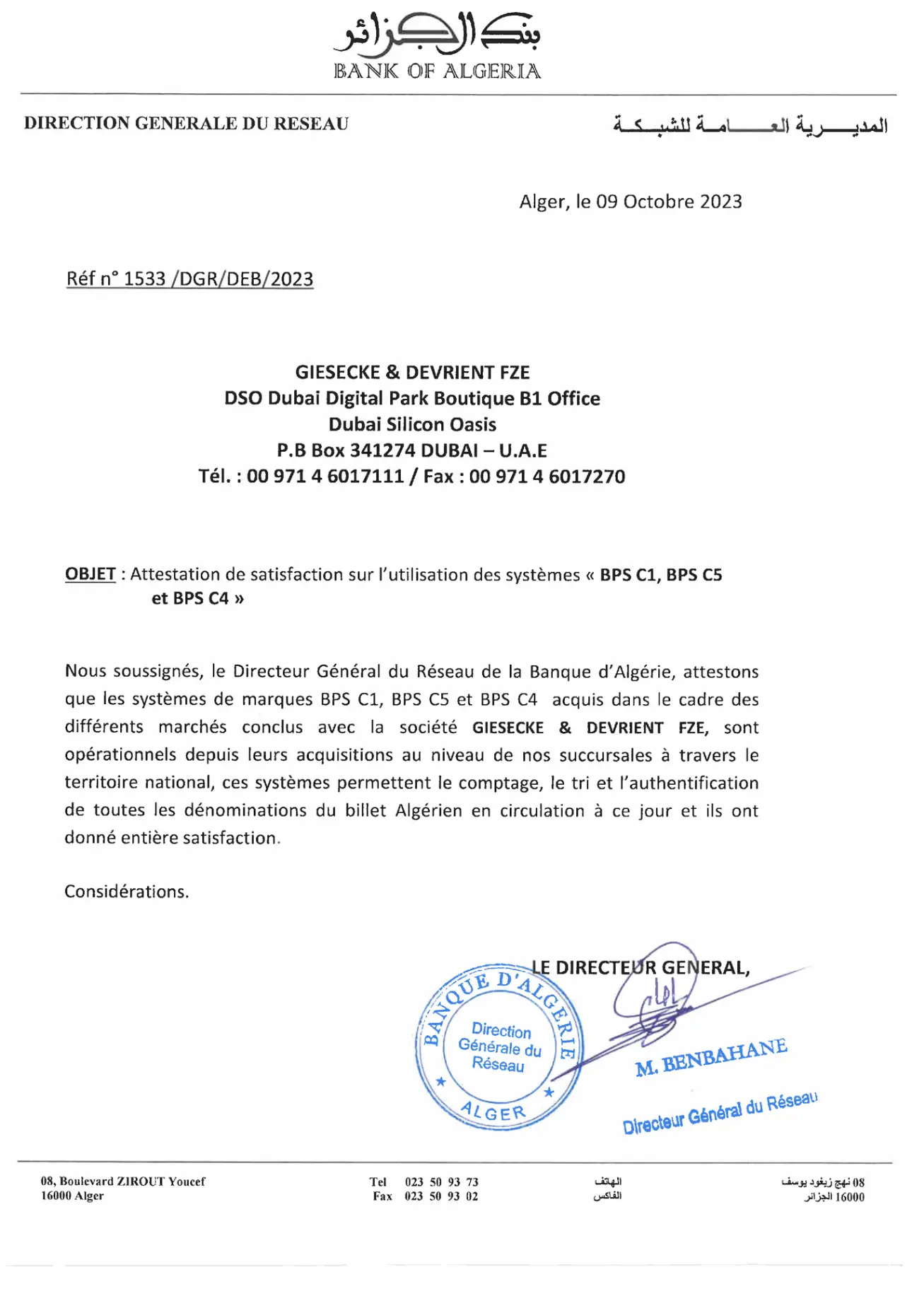 (Feed-back client pour 03 machines vendues auprès de la Banque D'Algérie)
